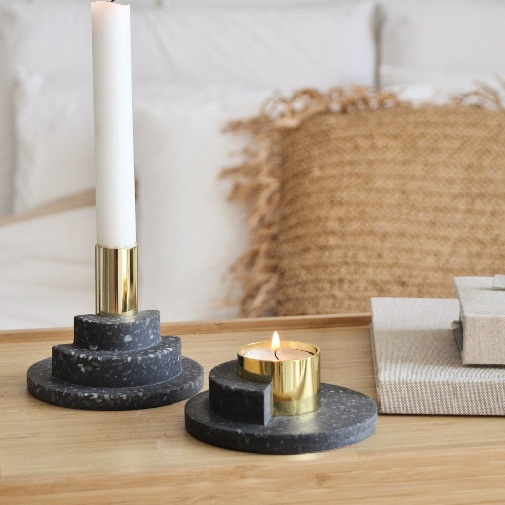 Der Docht muss nicht angezündet werden, dass der Teelichthalter PLY deine volle Aufmerksamkeit auf sich zieht. Dank der Verwendung der modernen Materialien Terrazzo und Goldstahl und der architektonischen Komposition strahlt der Teelichthalter eine schlichte Eleganz aus.