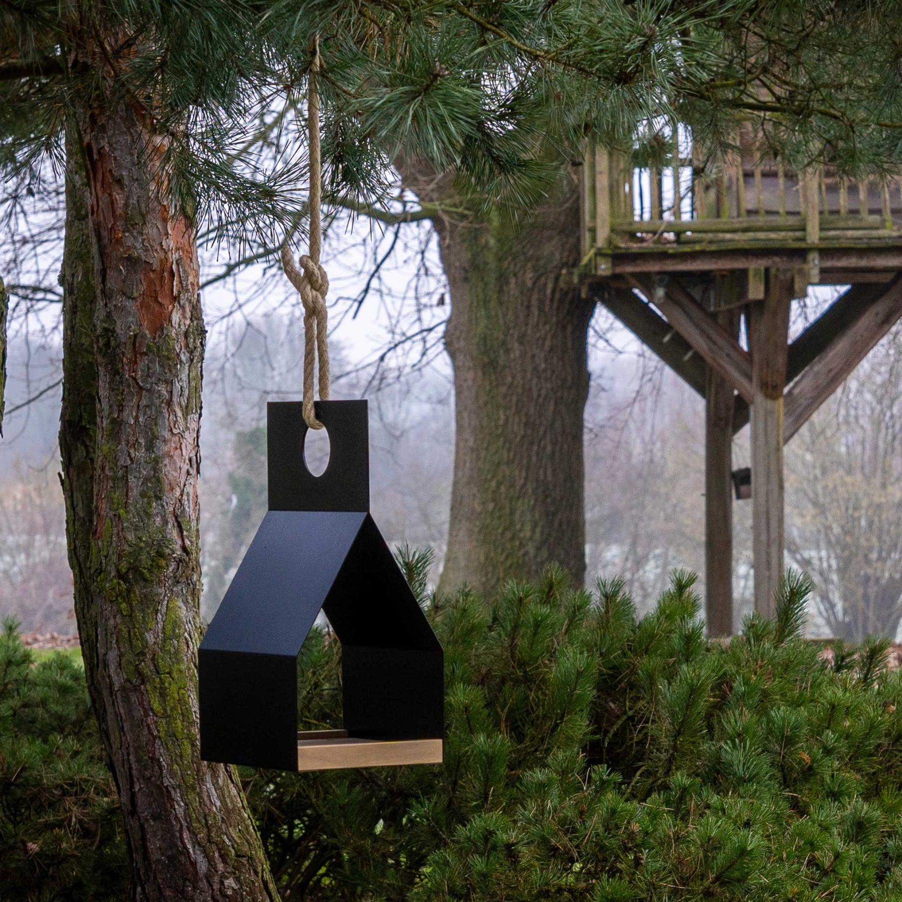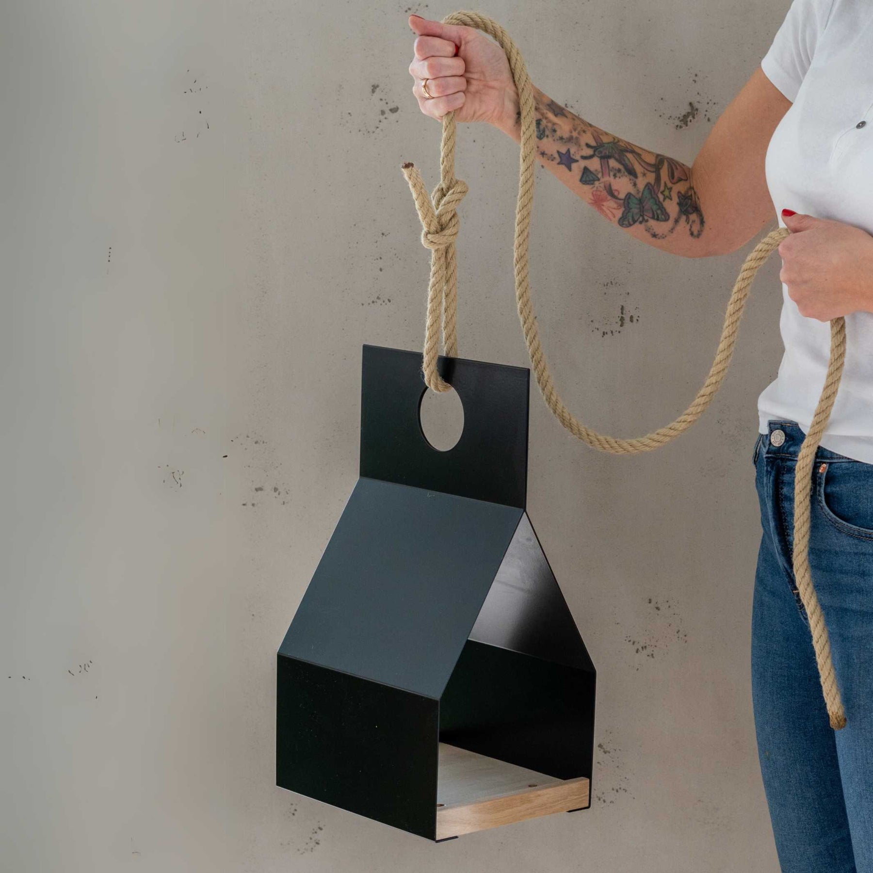 | Material | Black powder-coated aluminum sheet with fine structure | solid robinia with untreated surface | polyhemp rope |