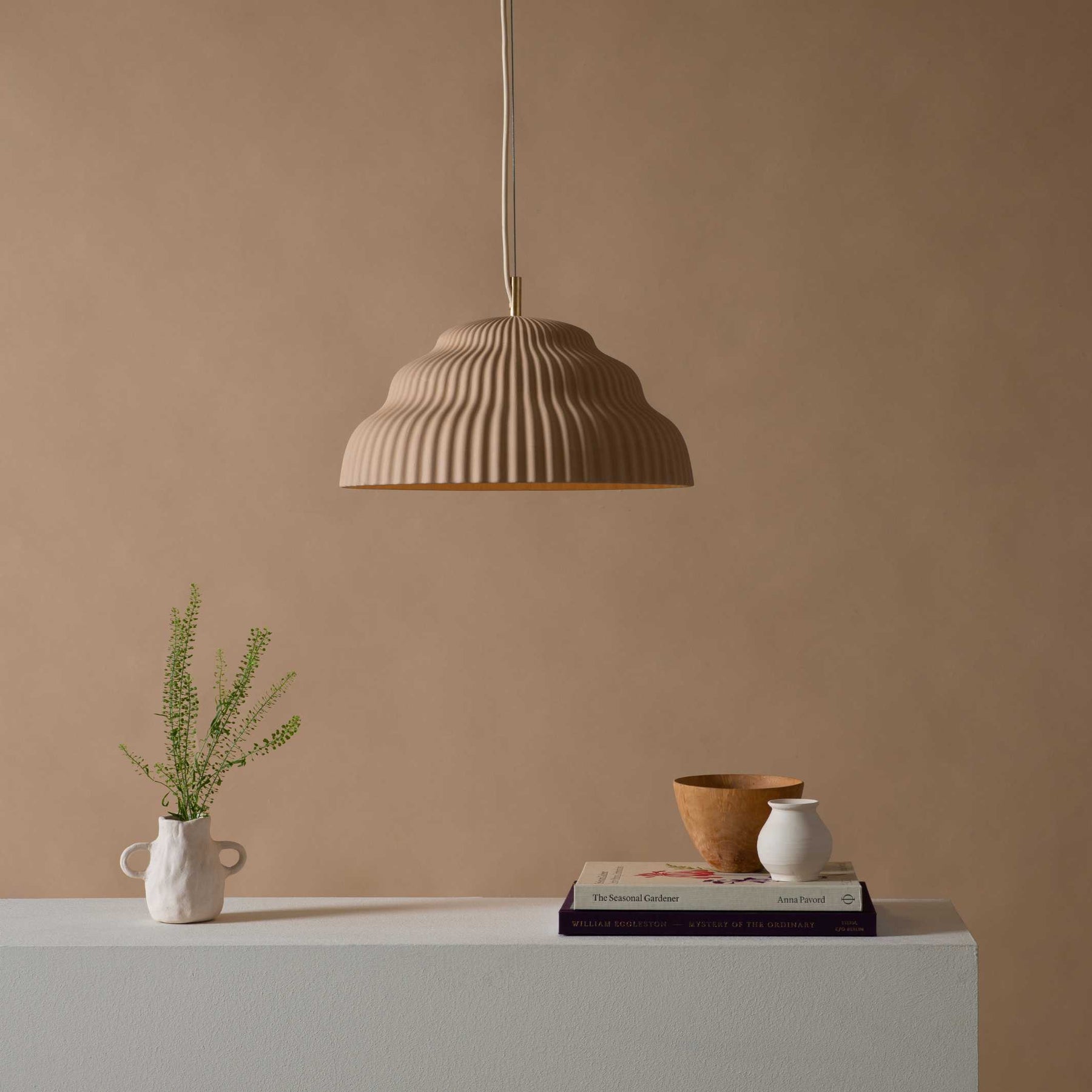 Bold round shapes and lively waves, reminiscent of the flowing water of a waterfall, define the luminaire's silhouette. The lamp presents itself in a whole new light and develops a distinct visual feeling that is emphasized by its gently textured surface.