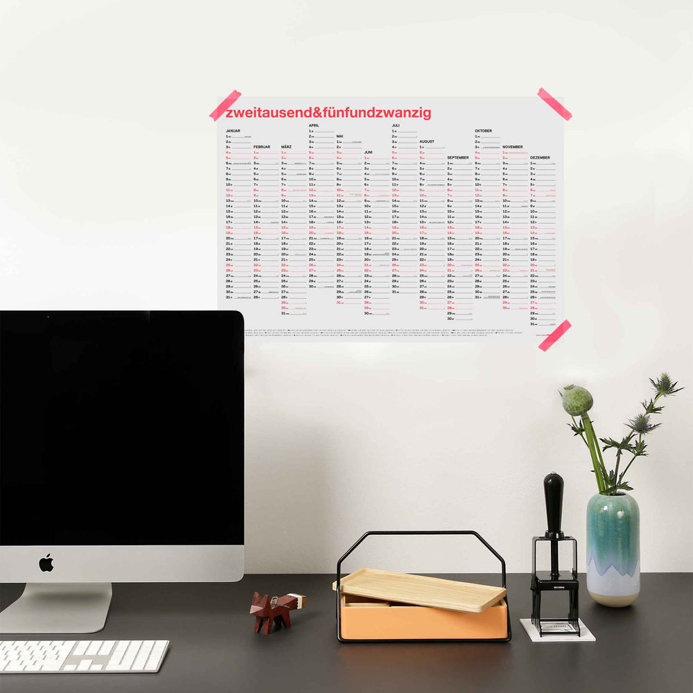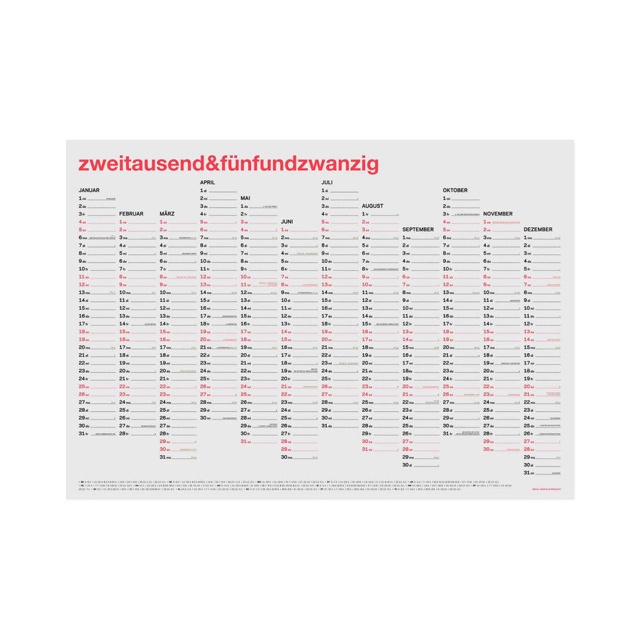 Der Kalender ist als dreifarbiger Siebdruck produziert: Schwarz als Grundfarbe für die Wochentage. Ein Neon-Korall, wie es der Monitor gar nicht wiedergeben kann, für die Wochenenden. Und als Akzentfarbe für die feinen Einträge pures Gold. Gedruckt wurde auf Kaskad hellgrau 160g – ein feines, hellgrau durchgefärbtes Papier. Wunderschön und sehr speziell!
